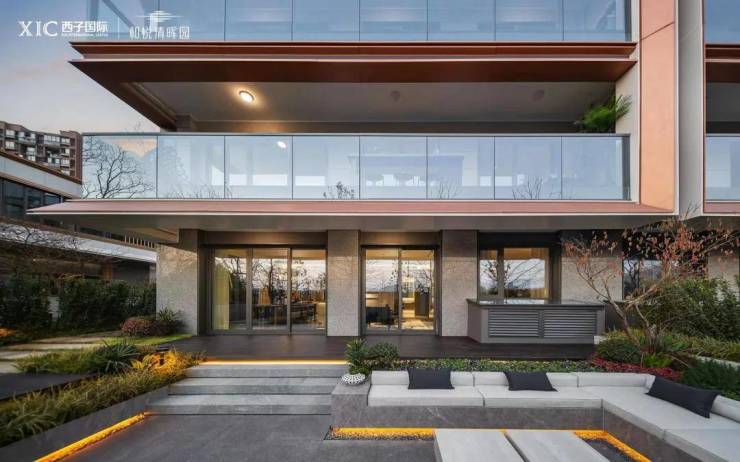 和悦清晖园建筑设计由绿城六和(GLA)执笔,以大面金灰色镜面玻璃为主打,斜切45度角的玫瑰金边框勾勒,线条简约灵动,不仅辨识度高,且极具潮流感。景观则是由上海朗道操刀,其代表作包括刚交付的江河鸣翠等。
