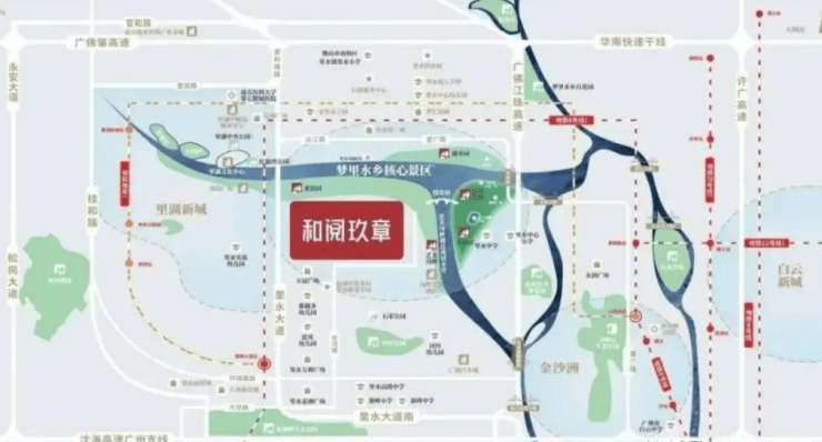 龙光越秀·和阅玖章位于里水老城芯,里水河的三江交汇处,坐拥南向一线江景,由龙光和越秀两大头部房企联袂打造。