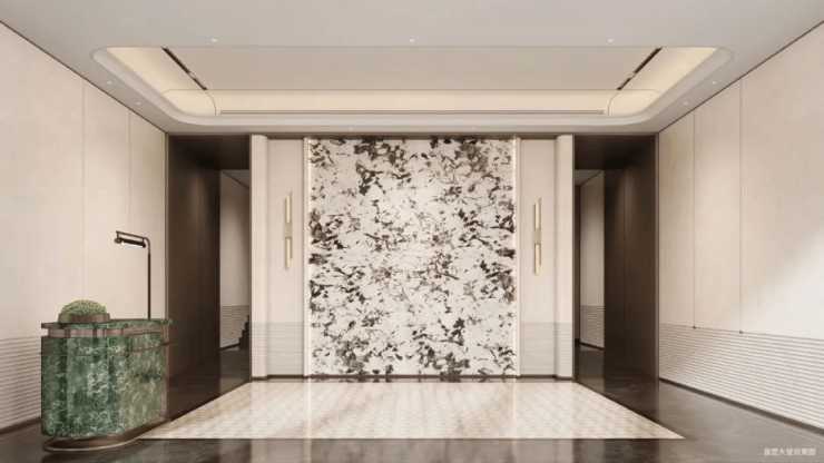 项目地上+地下双装修大堂设计,为业主带来尊崇感、仪式感兼备的归家体验。如果是车行回家,这个“奢阔的地下车库”,星空顶+雪山银狐背景墙,打造一场视觉上的感官盛宴。