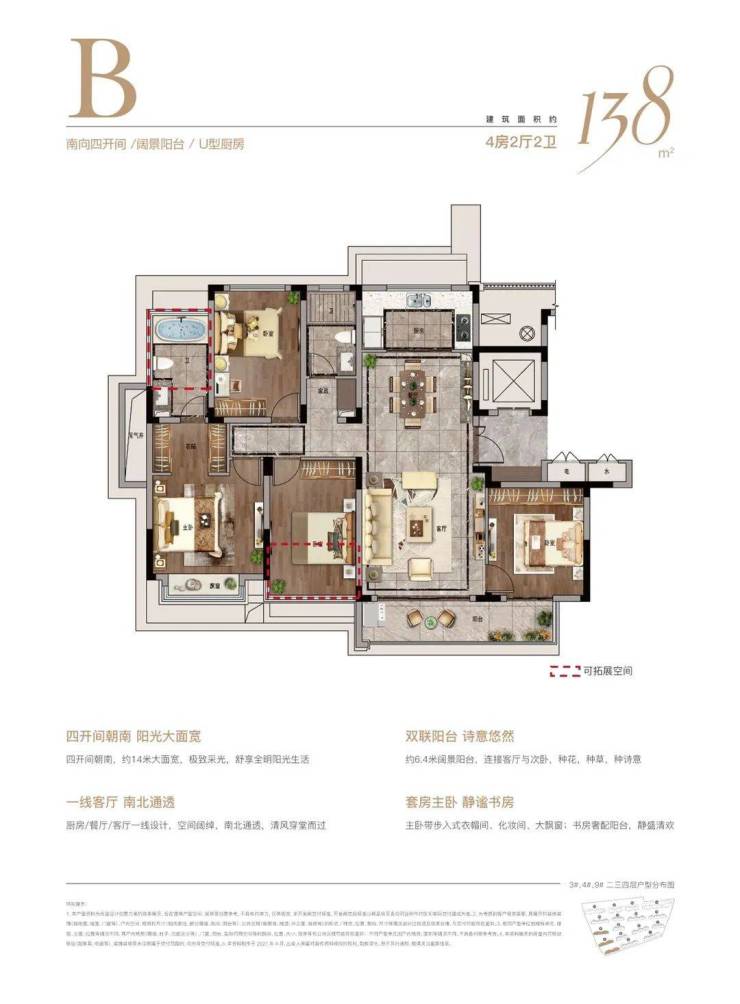建面约138㎡四室二厅二卫:客厅与次卧共享约6.4米的跑道式双阳台,空间非常大气。主卧走入式衣帽间以及预留浴缸位,精致改善生活可以想见,整个洋房户型的得房率约90%,空间利用率非常高。约14.2米的超大南向面宽,让整个室内通透明亮。串联起客厅和次卧的阳台,长约6.4米,摆上一排绿植,莳花弄草的诗意日常在家就能实现。