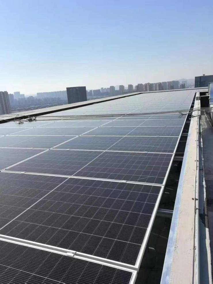 大面积铺设太阳能光伏板,楼顶光伏发电,楼下充电桩充电,自发自用,余电上网,有效降低园区能耗,为企业主削减长期运营成本。