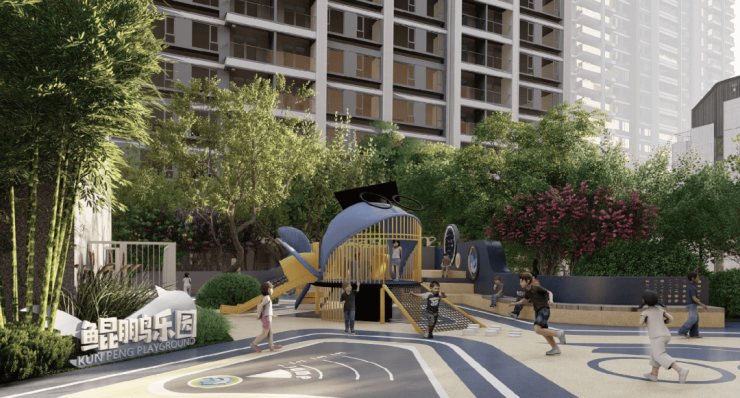 以“鲲鹏乐园”主题儿童乐园、鲲鹏书院、老人颐乐空间、多元艺术花园、约760m“汽车文化”主题跑道、森林漫步道等共享场域为居者构筑一个有温度的社区。