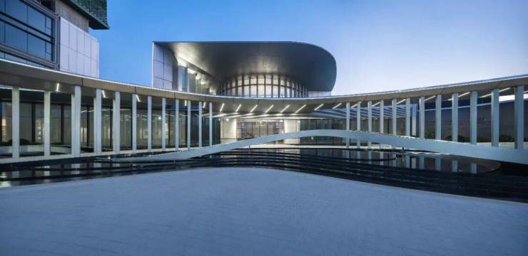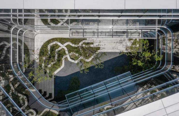 立面线条衔接处,以iPhone的圆角弧度灵感代入,又好似流淌的江河之水,与剔透的大面积玻璃一起融于天幕中。