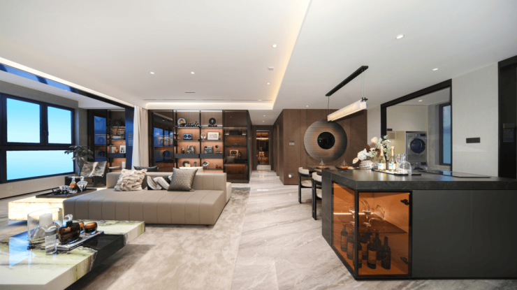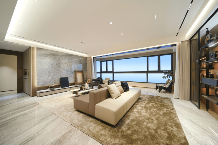 阳光透过大面积的采光窗倾洒而入,照亮了客厅、餐厅与厨房。