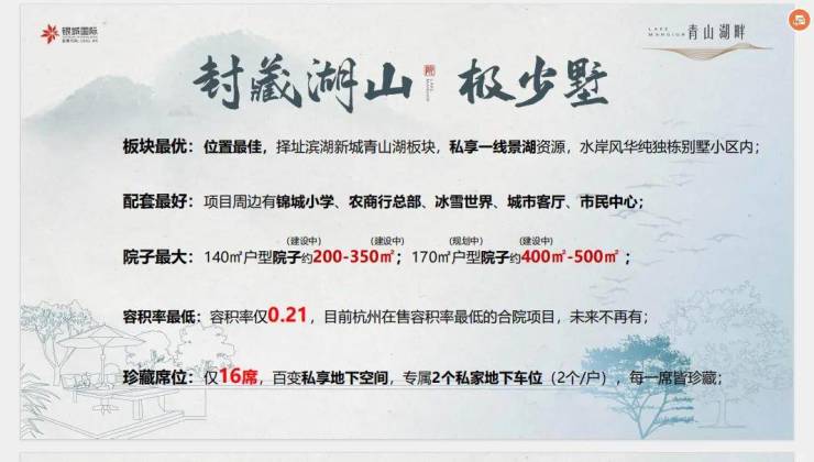 容积率最低:容积率仅0.21,目前杭州在售容积率最低的合院项目,未来不再有;