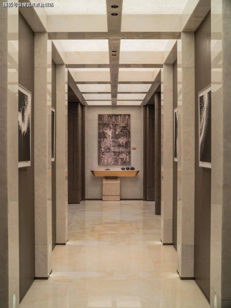 步入门厅,便是层高约4.2米的空中艺廊,从地板到天花,皆为白色玉石通铺。