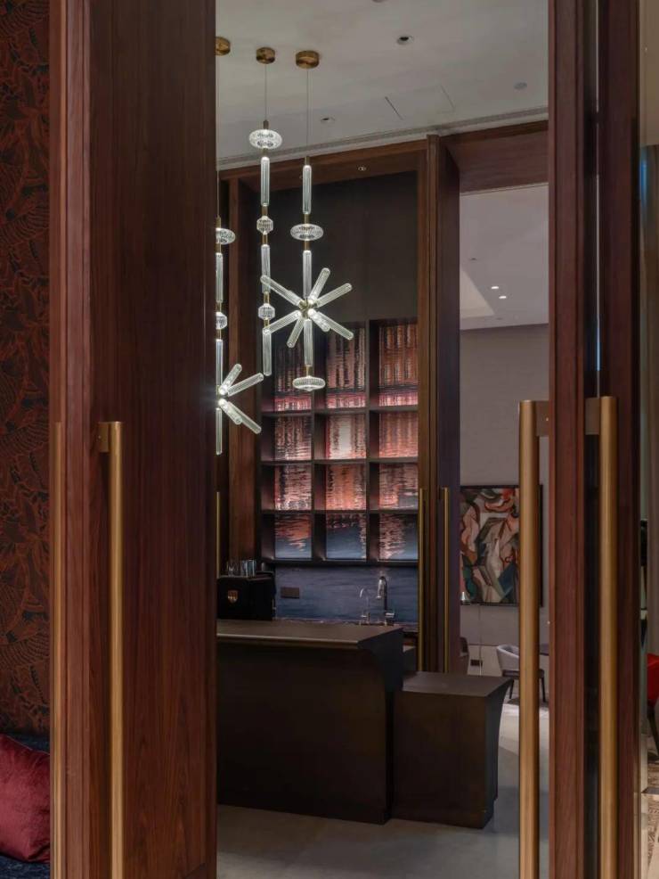 在VIP室与水吧之间,设有四扇起到区隔作用的通顶式黑胡桃木门,建立起富有张力的空间秩序,彼此“分而不离、合而不扰”。