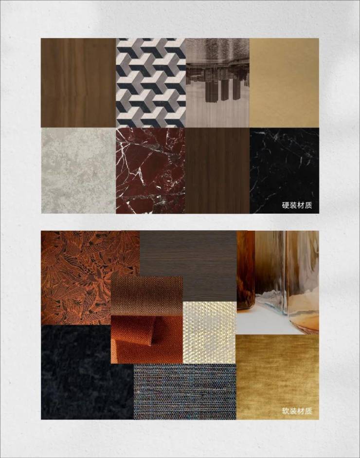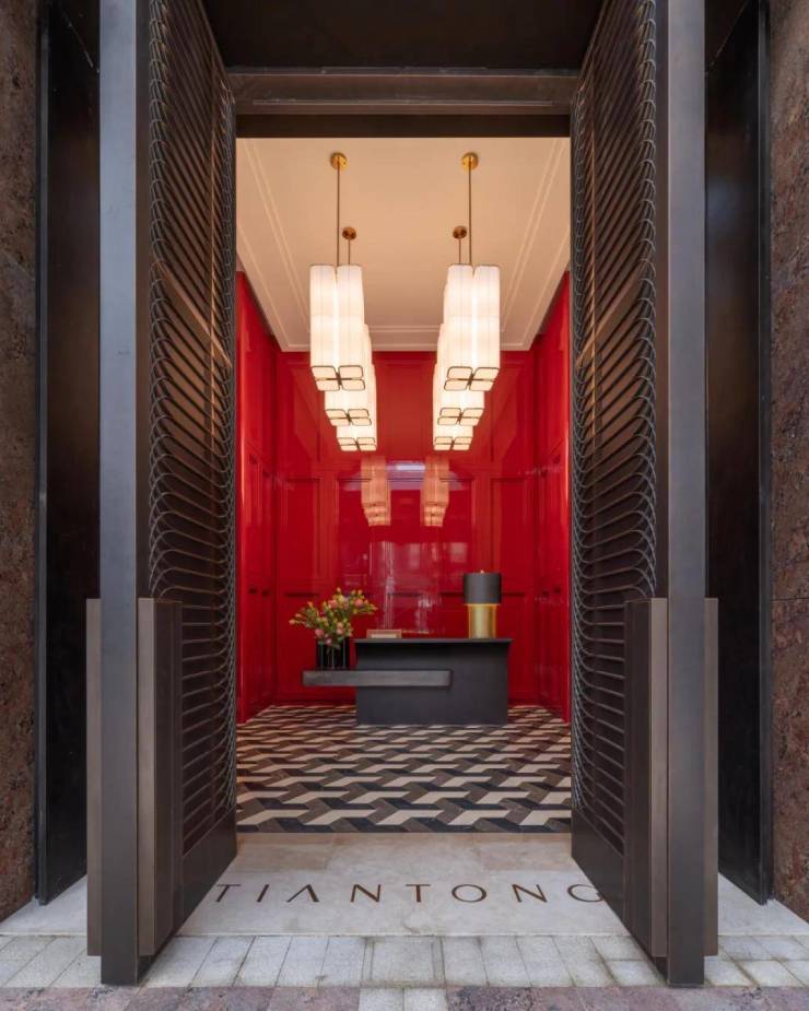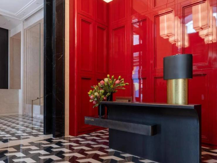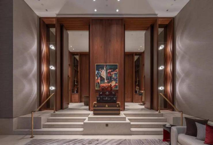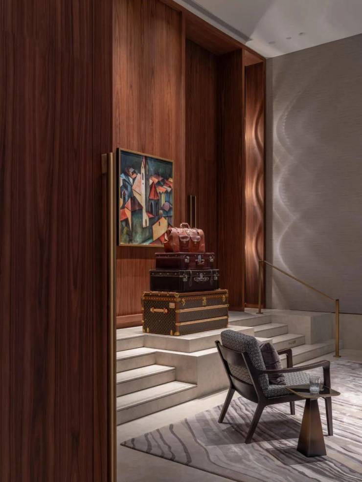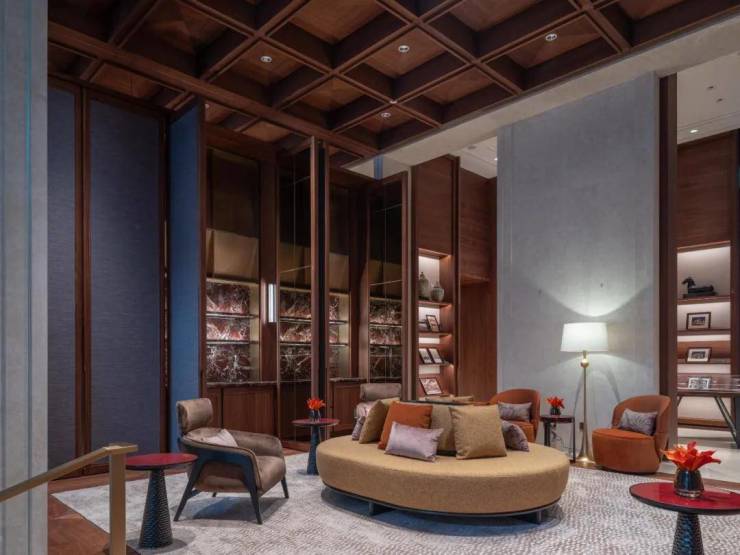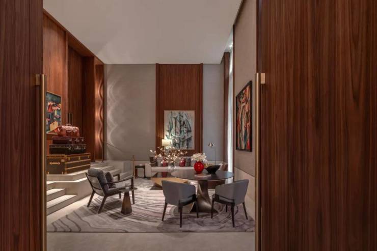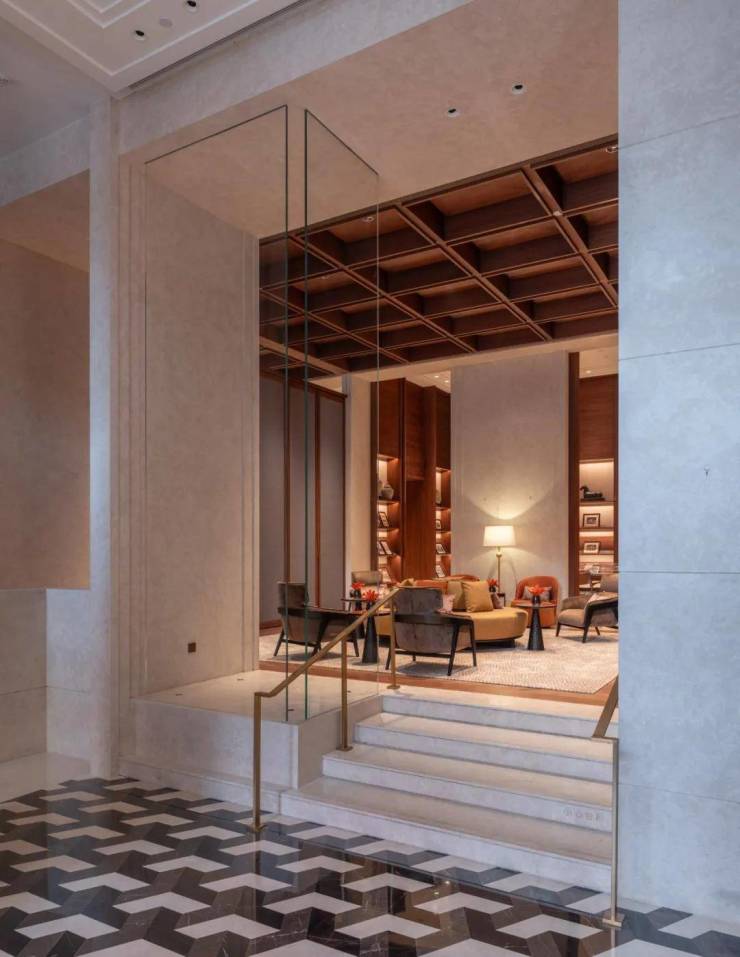 接待空间采用东西通达的开放式布局,大量运用深色胡桃木饰面,与米色石材互为对比,构建出温暖的基调。极富匠心的木质吊顶,采用20世纪初的设计手法,呼应了地板的拼花效果。吊顶的每一片木料都经过仔细遴选,确保纹路与色调和谐统一。