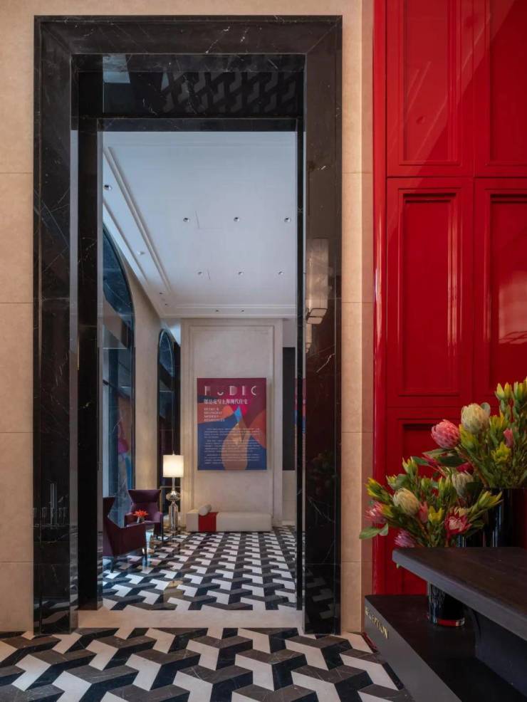 前厅正中置放线条简洁的接待台,看似素朴,实则暗藏巧思。侧面来看,桌台的形态犹如拱券的切片,还原了上海最经典的弧线,同时也与建筑立面互为呼应。桌角的黑金撞色台灯,进一步丰富空间色彩,安居一隅仍绚烂夺目。