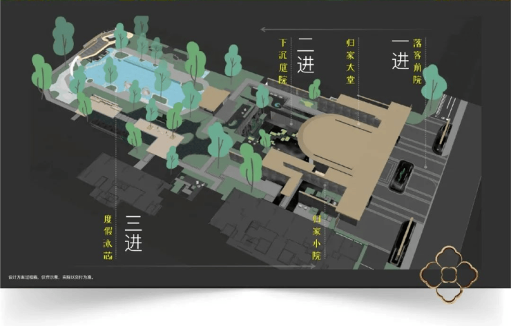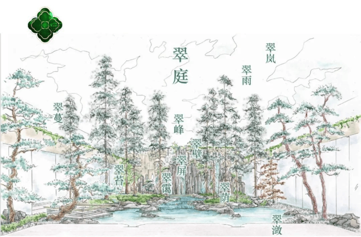作为2024年绿城首个面世的全维示范区,桂月云翠显然承担了更高的使命,约1.2万方的示范区,以三进式院落空间为主轴,汇聚归家大堂、地下会所&下沉庭院、泳池综合区。于桂月云翠而言,每帧园景,每棵树木,都有其特定“精神”,经历过翡翠般的“精细”打磨,植物丰盈了景致也点缀了心绪,就如园林之于园区,生长为我们生活中不可分割的部分。