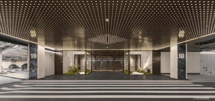 桂月云翠的车行入口不仅和大门一体化设计,它的通高还让车行归家极具仪式感。地库单元入户门口的整个天花板,都装上了光彩熠熠的星光顶,一直延伸到行车道;会所入口还专门设置了访客车位,以后和朋友约见面,可以请他们开车下地库,直接停到会所门口。
