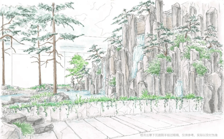 最终,在庭院这方微观世界中,筑山、步道、水瀑.....方寸之庭,处处皆景,充斥着综合的体验,令庭院与园区之间自成天地又相得益彰,吸引居者驻足。随着翡翠贯穿庭院,带来的感受细化至听觉、视觉甚至触觉。