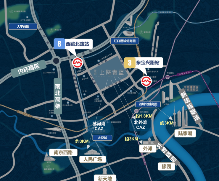 项目双轨交环绕,距离最近的8号线西藏北路站直线距离仅约500米,约1.5km范围内,还有3号线东宝兴路站。乘上地铁,从「新湖·上海青蓝」2站可以直达上海火车站、3站直达人民广场,4站到达南京西路、5站到达陆家嘴……便捷交通,通达全城热点板块。「新湖·上海青蓝」区位示意图