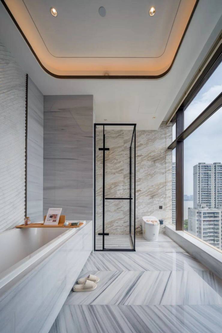 一是石材的大面积铺陈。基本上所有公区以及卫生间,都被覆盖到了,并且用到多达8种以上名贵进口大理石。