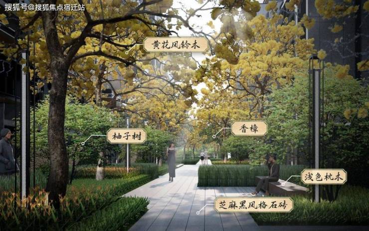 路面铺陈福鼎黑花岗岩烧面与芝麻黑风格石砖,肌理细腻耐久,随岁月沉淀历久弥新,林下的椅子由浅色枕木打造,带有温润的自然纹理,温润舒适。