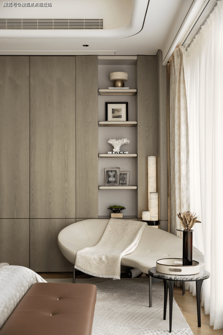 主卧来自Eda-Mame 的艺术躺椅,以弯曲和蜿蜒的线条为特征,宛如母亲的怀抱,温馨而舒适;个性创意的设计与高雅简约的色调自成意趣,彰显主人的艺术品味与生活情致。整体铺陈清雅而温润,纳入功能性与美学性相结合的设计理念,实用与美感平衡,疗养与情致并存,让长辈的生活更安稳舒心。