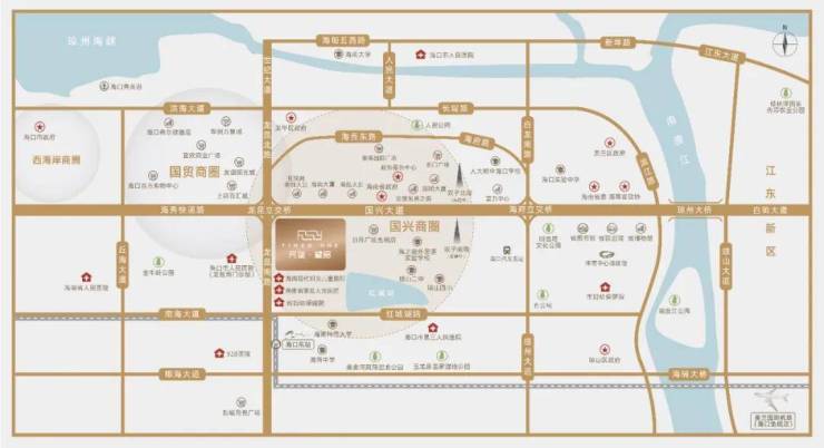 立体交通:国兴大道、龙昆南路、海秀快速路交汇,约4公里可达国贸老城区、海口东站、海口汽车客运总站,5公里辐射海口各大核心商圈,经机场联络线约20公里到达美兰国际机场。
