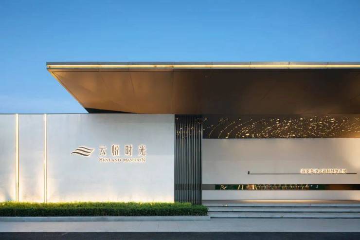 入口处门廊顶星光点点辉映。在空间的处理上,设计团队采用对称式的布局方式,景墙采用纯净大气的墙面,内置金属格栅,虚实相映。阶梯式入口草阶景观,视野开阔。整个入口空间形成大尺度的延长展示面,打造简约大气而又不失仪式感的第一进迎宾景观空间,并且作为导入空间也为后续景观向内延伸起了铺垫作用。