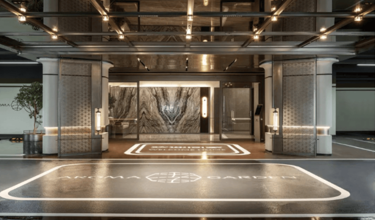 像申江三部曲的上海绿城外滩兰庭,在门庭主入口打造了具有“宝格丽”酒店气质的水景与酒店式落客区,铝板+玻璃幕墙+海派标志性圆弧倒角构建的绝美立面,刷新上海大平层的颜值天花板。