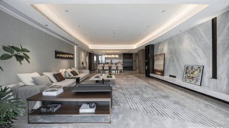 以会客厅为例,南向超6米奢阔尺度,有着约近百平的超大空间,整个尺度可在互动空间里可以创造出更多精彩的可能;欧努灰天然大理石铺面,冰岛白大理石背景墙,营造奢雅的生活气质;室内整体智能化灯光设计,在光与影的交融中,烘托出了一种契合当代格调的高级氛围感。