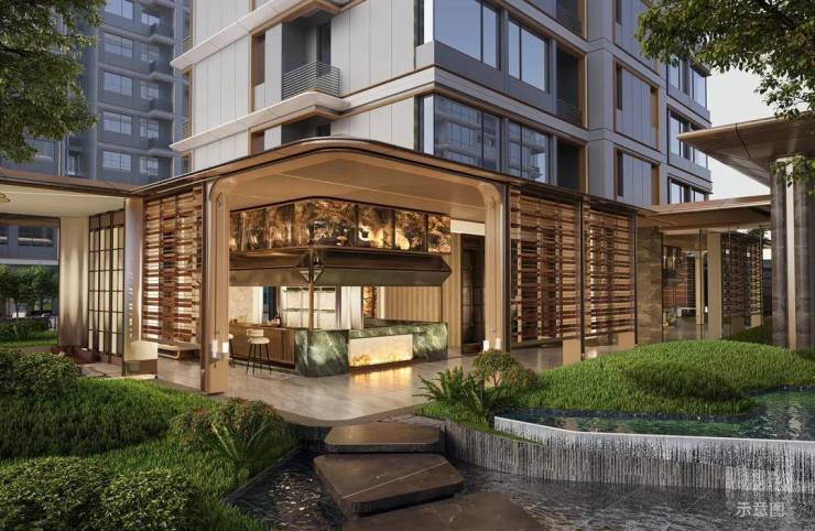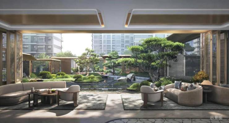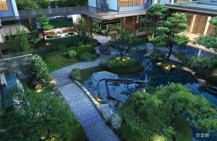 浮桥渡水,松、景、石、水交织,以家人的全时景观客厅为定位,让业主家人尽享东方诗意休闲时光。