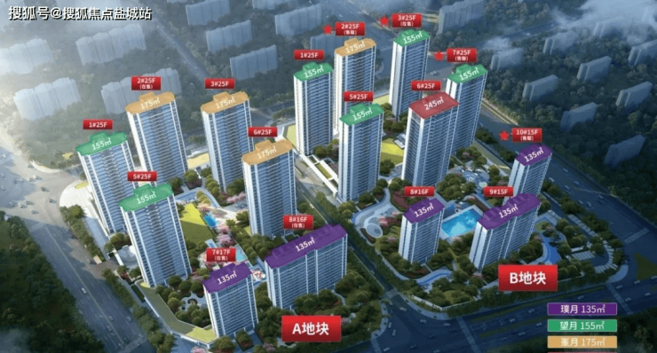基础数据:占地76亩,分AB地块,共16栋754户(A区7栋,B区9栋),总高16-25层,主要2梯2户和3梯2户设计,面积135-155-175-245平(245平毛坯,其余精装)