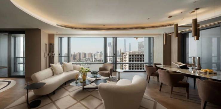 来到室内,1:7的极致窗墙比使得整个采光和视野都达到了最佳。为了匹配江景,边套户型采用的都是270度的L型转角设计,全景的落地窗让业主可以沉浸式享受江景。
