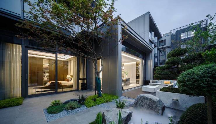 云湖印建筑立面采用大面积玻璃幕墙辅以灰系铝板装饰,呈现都市现代极简气质,满足高素质人群对人文艺术生活的追求,同时,作为之江难得的平墅产品,约1.8低容积率,营造真正的舒适居住秘境。