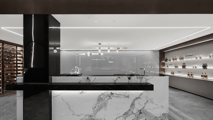 穿过岛台 另一侧是品酒室,大面积玻璃与石材细腻的纹路相结合,在起承转合间能够捕捉到,彼此细腻的纹理与形态,金属与皮质的加入加强了空间层次,沉浸酒香 闲适随性!透过视觉感官 激发内在能量,利用自然之韵,唤起人们对居住形态的迭代需求,德信浮山云湖印在沉稳中追逐未来,探索当代人居的更多可能!