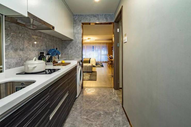 东港空间这个「LV」造型就可以顺理成章,把「单廊设计」贯彻到底。使得它南北双向都有窗,采光双向,通风也可以对流,实现了酒店式公寓里的「南北通透」。在目前杭州主城区的酒店式公寓里,除了特别大的户型,基本找不到类似的。