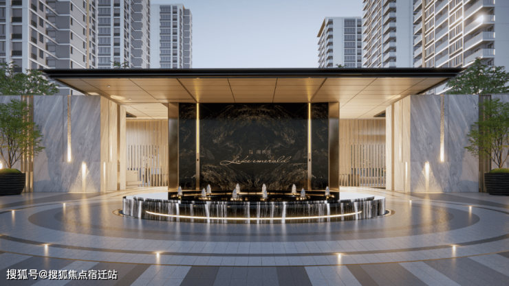 在湖映里,大气的酒店式入户大堂,顶部大挑檐,岩板背景搭配金色金属格栅,两侧的休息区连接着风雨连廊,每一处细节都彰显着尊贵气质,无论是出门时的憧憬,还是归家时的喜悦,都能让生活充满仪式感。▲湖映里入户大门效果