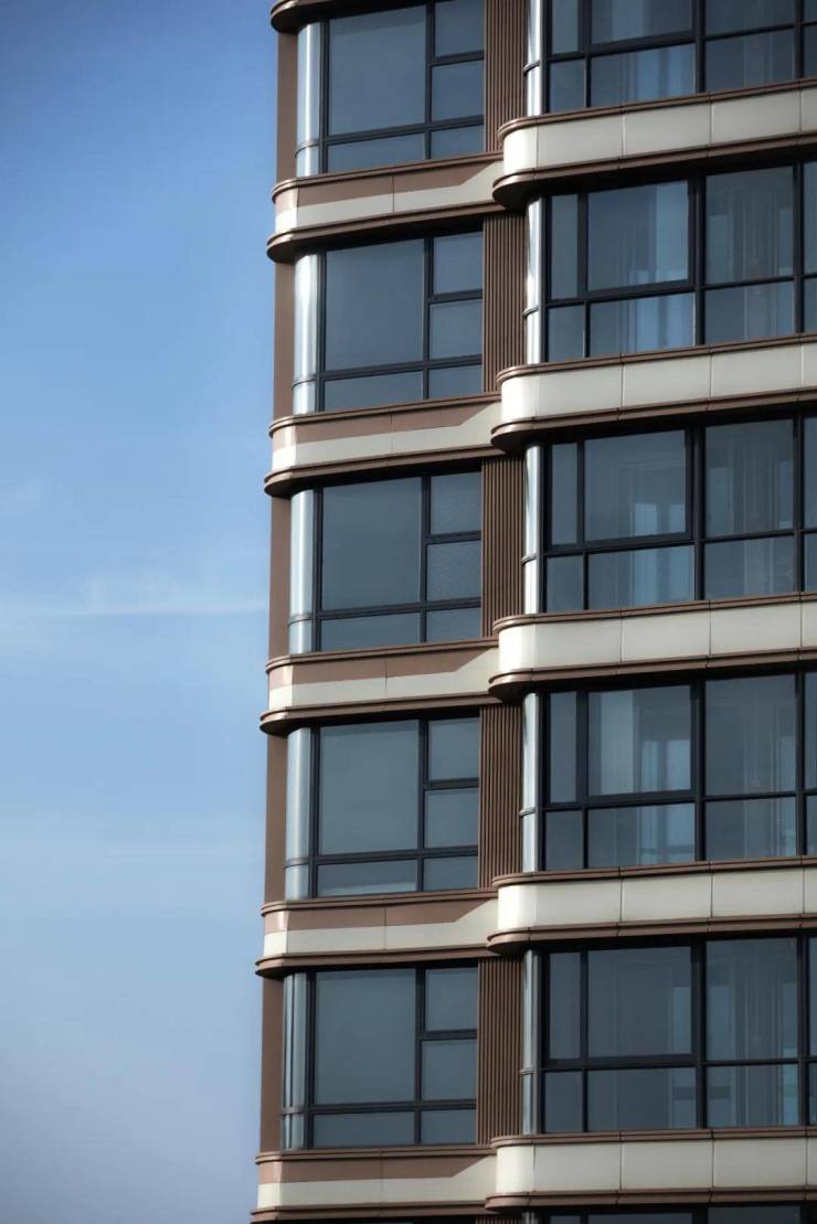 扬州首家,外墙全部采用铝板到顶+弧玻设计,窗户是:系统窗+三玻两腔,对标世界地标豪宅的美学基因(迪拜“公主塔”、香港“天汇”到上海 “汤臣一品”)在立面选择上,都不约而同地选择——铝板幕墙。