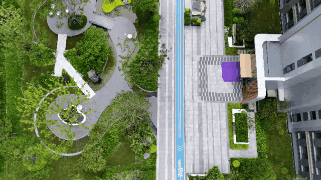 林荫空间,潺潺流动的叠水成主角,与精心栽种的植物相映成趣;旱溪小桥花境,小溪曲折蜿蜒,水底瓦片堆叠。近距离观察,朴树、榉树、红枫等禅意十足,投射出静谧浓荫。
