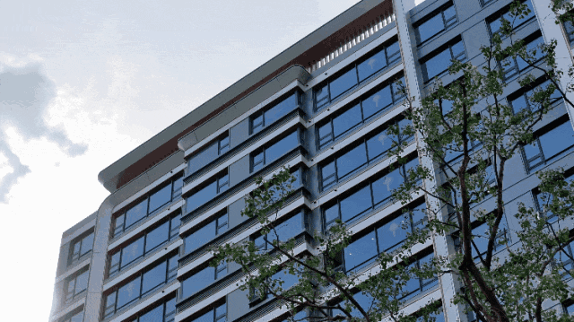 优雅的铝板一体板和大面的澄净玻璃,在阳光下熠熠生辉;横向的香槟色金属线条,呼应云锦工艺的“通经断纬”,有秩序井然的线条感,又增晶莹剔透的轻盈感;顶部华贵的弧形曲线头冠,云锦立面美学涓涓流淌。