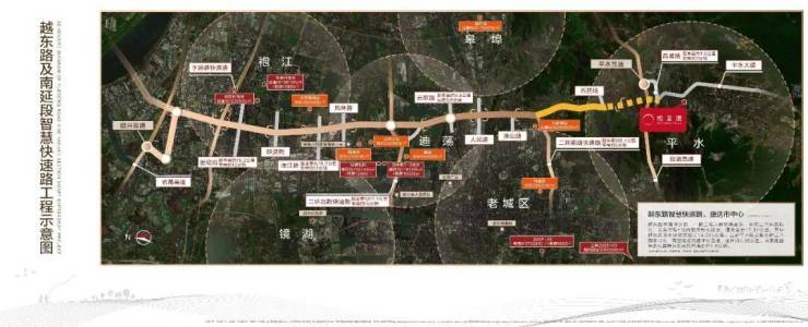 越东路智慧快速路:南至绍诸高速平水互通,全场20多公里,悦景湾距离越东路南端约1.8公里,按照越东路快速路80km/h的规划时速,未来可以20分钟畅达城东、迪荡、袍江、滨海。