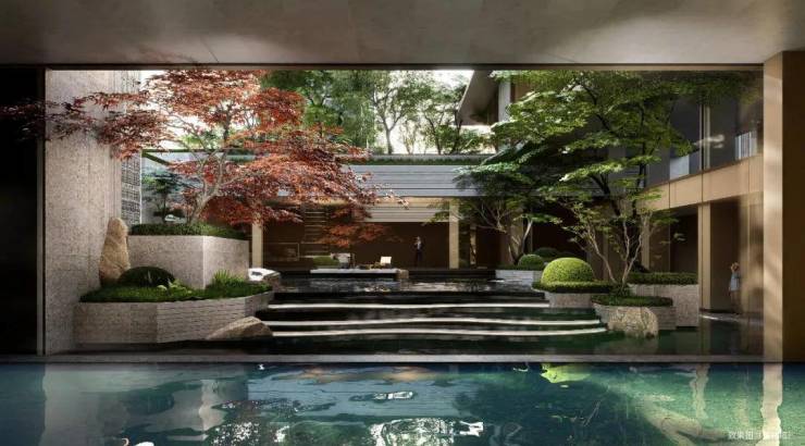溯源曼谷嘉佩乐酒店和纽约安缦酒店灵感,打造“水上”迎宾通道,约100米超尺度城市界面,进深约36米的镜面大水景;借鉴新加坡Parkroyal on Pickering的垂直绿化形式,打造悬浮绿洲;以更立体的设计手法,构建城市浮岛的超级入口。
