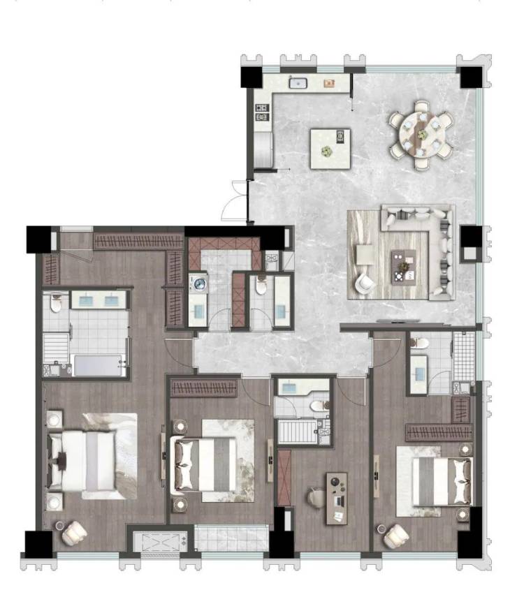 从户型结构上来看,270方做了四房三卫设计,其中一个卧室设计了室内阳台,解决了一部分客户对阳台的需求。另外所有的卫生间都是做了明卫设计,保障了卫生间的通风及采光。约12平米、u型设计并配置了博世5件套的厨房,让不少前来看房的女性朋友为之心动,毕竟在这样一个宽敞又明亮的厨房里,做饭也是一种享受吧。