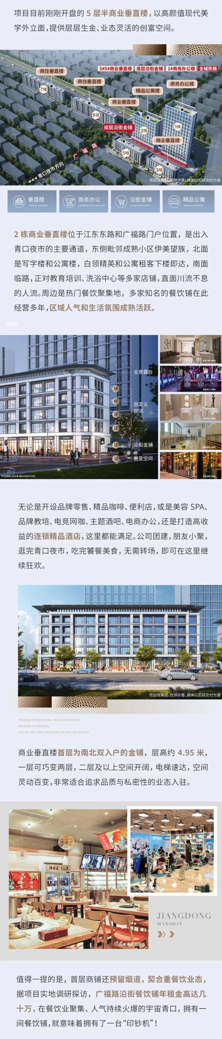 江东印象,总体量约5.5万方的新E代财富综合体,集2栋商住垂直楼(火热预约中、2栋商业垂直楼、1栋精品公寓楼、1栋商务办公楼和少量沿街金铺五大业态为一体,多元业态相互支撑反哺,吸引行业头部企业,吸附精英人才和全球客商,共筑繁荣活力的财富磁场。