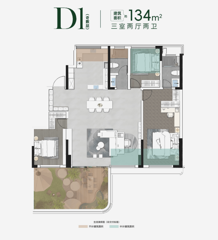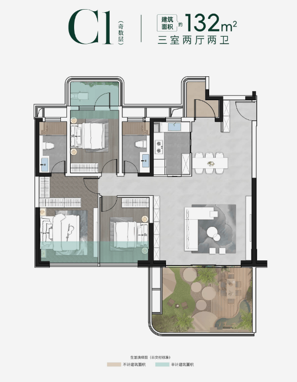 除此之外,建面约 110-132㎡的平层户型,通过阳台与空中花园的超高赠送设计,让实际使用面积远远大于传统户型。