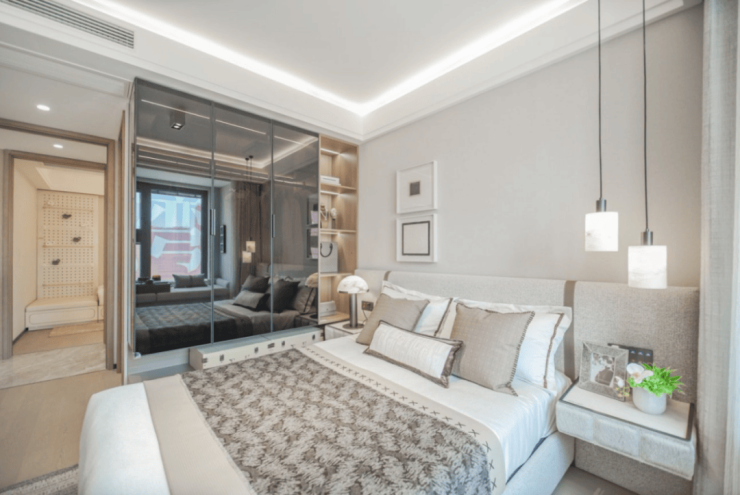 静安玺樾两房户型的设计更加宽阔舒适。遇到亲友来访小住,同样能够妥帖安排暂住空间。大师样板间内,灵动可变换功能的客厅柜,拉开之后可变为一张安睡床,即可实现两房临时变换为三房的匠心巧思。