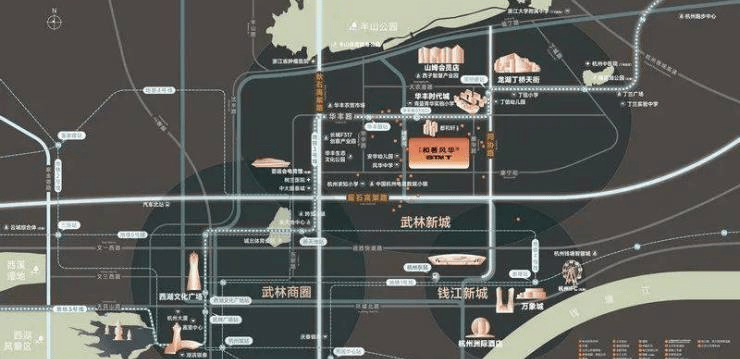 先看武林。武林自古繁华,2017年杭州提出以武林广场为原点进行扩容。奈何往南是老杭州人情根深种的城市地标,只得向北延伸。保利和著风华里所在的华丰商圈,就正好在武林北延的繁华带上,拉动了地段价值。(武林实景图,来源于网络)