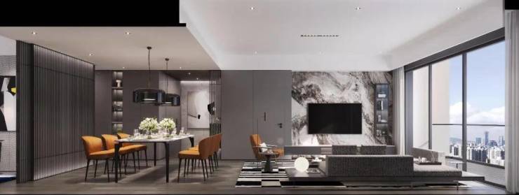 米白色与浅灰色结合的立面色彩,选用“高透光、低反射”的大面积落地玻璃,搭配香槟色铝板和石材等高端材料,实现超高南向窗户比,打破空间壁垒,这样的立面肌理,让每一套房子都变成看得到风景的“城市观景台”,卷王实力一览无遗。