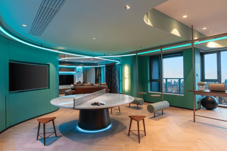 还有吧台、休闲洽谈区、共享会议和健身等功能区,是一个适合交友、会客、休憩、工作、读书、赏景的多功能空间.处处可见的时尚元素,符合当下年轻一代喜好。