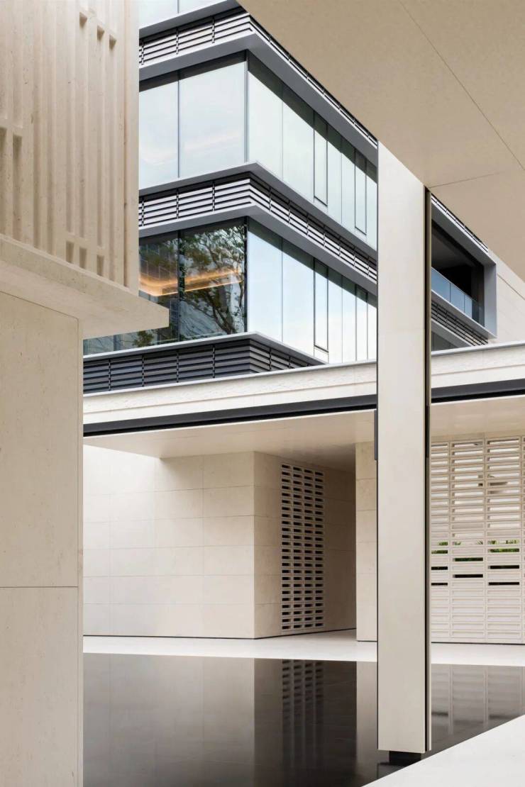 尤其是南立面,石材的厚重、玻璃的通透、均釉陶砖的温润,刚柔相济的三种材质,在0.618严格黄金比例的统摄下,交织出极富艺术张力的奢华感。