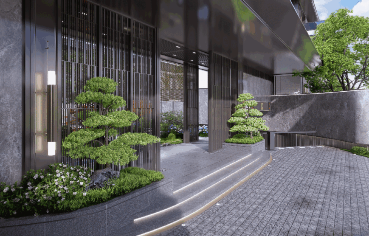 现代中式风格建筑立面,强化了景观的整体性与共生性,讲究线条的简约、质朴,注重建筑的流线性,又包含中式风格的点缀。外部的立面采用石材、铝板、真石漆搭配,顶部还配有灰色坡屋顶设计,结合统一的公建化玻璃窗,营造典雅时尚的建筑形象,项目外立面1-2层全部选用干挂石材,铝板线条,大气美观。