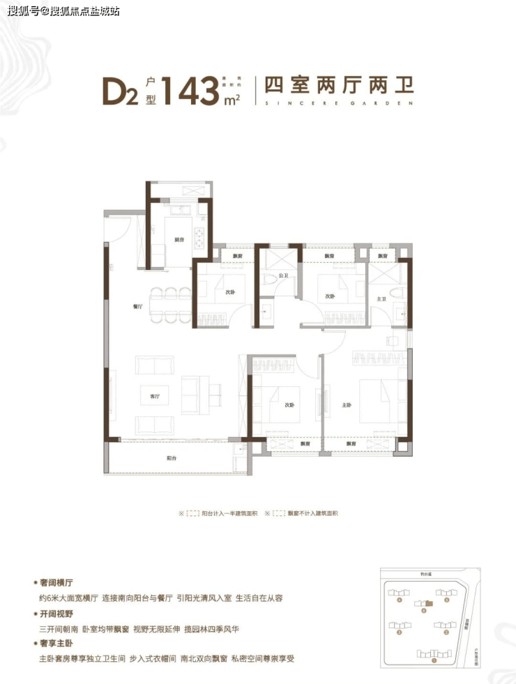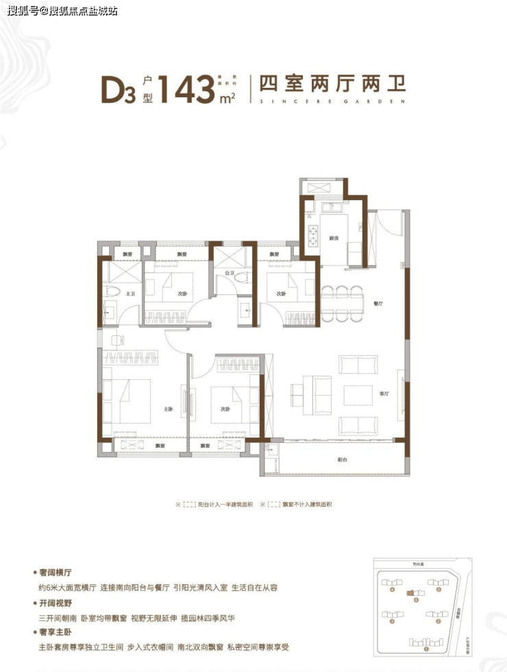 143㎡四室两厅两卫 以D1户型为例,它将阳台的尺度扩至约9米,且连通大面宽横厅与次卧,家人在客厅看电视或者在卧室休息,无论是采光还是通风,都能提升生活的惬意感。在卧室空间,三卧室都带飘窗,超大的观景视野,与自然零距离。