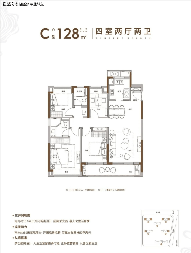128㎡四室两厅两卫户型 采用南向约10.6三开间朝南设计,采光面更大,最大化生活的舒适体验。其次,相比于107㎡户型,该户型则增添一个多功能房,未来可以考虑作为书房或者自己的兴趣天地。