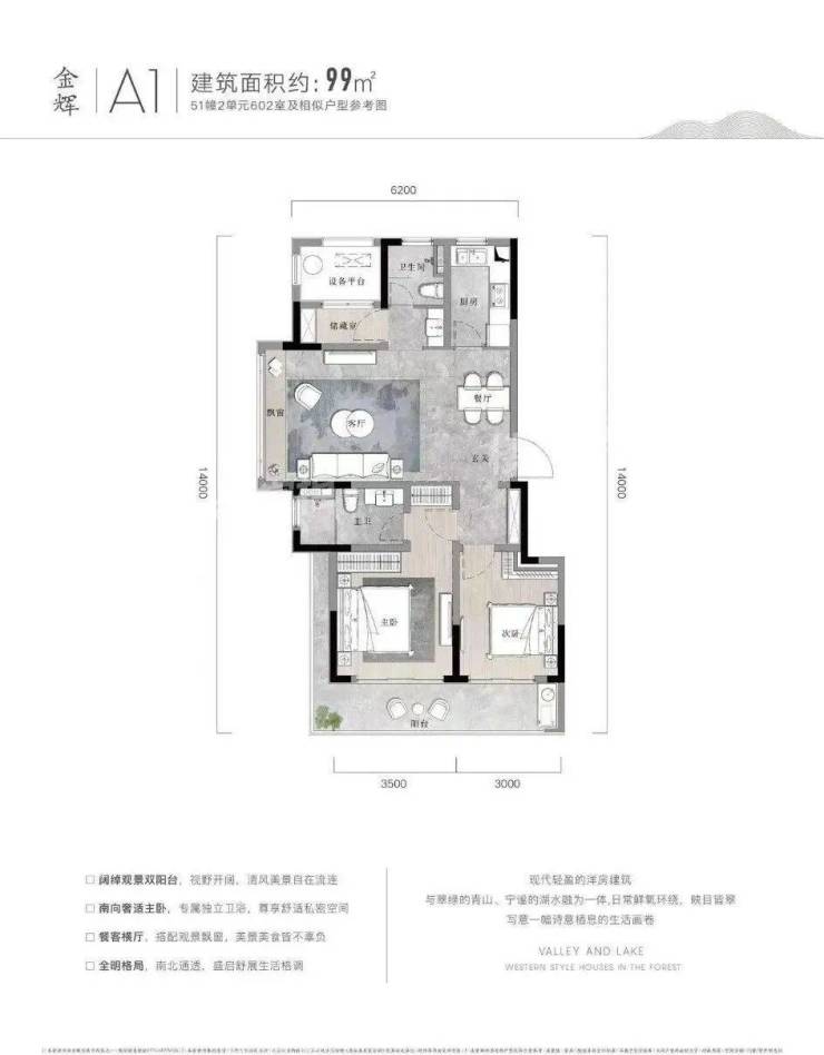 户型点评优势:双阳台设计,完美匹配湖山美景。客餐厨动线合理,观景飘窗连通了室内室外两重空间。南北通透、分区合理,尤其是储藏室的设计,十分贴心。99㎡的大两居,恰到好处地放大了各个功能区,整体看过去十分舒畅。