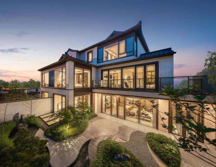 大丽和和中心中式美学院落的立面造型是在徽派基础上的当代表达,将古典建筑中粉墙黛瓦与自然景观之间形成色彩搭配与对比,结合现代风格建筑,打造形神兼备、有时代气息的新中式建筑。