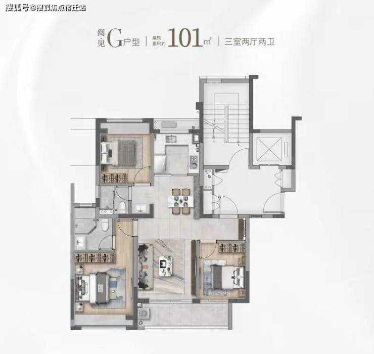 - 高层101㎡经典飞机户型:南北通透+三开间朝南,客餐厨一体化布局,主卧套房设计,无连廊干扰,得房率高达75%。